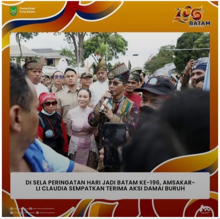 BeritaSatuKepri Batam – Di sela-sela rangkaian peringatan Hari Jadi Batam (HJB) ke-196, Wali Kota Batam, Amsakar Achmad, dan Wakil Wali Kota Batam, Li Claudia Chandra, menyempatkan diri menerima perwakilan buruh yang menggelar aksi unjuk rasa damai di depan Gedung Kantor Wali Kota Batam, Kamis (18/12/2025), sebagai bentuk komitmen pemerintah daerah dalam membuka ruang dialog dan menampung aspirasi para pekerja.