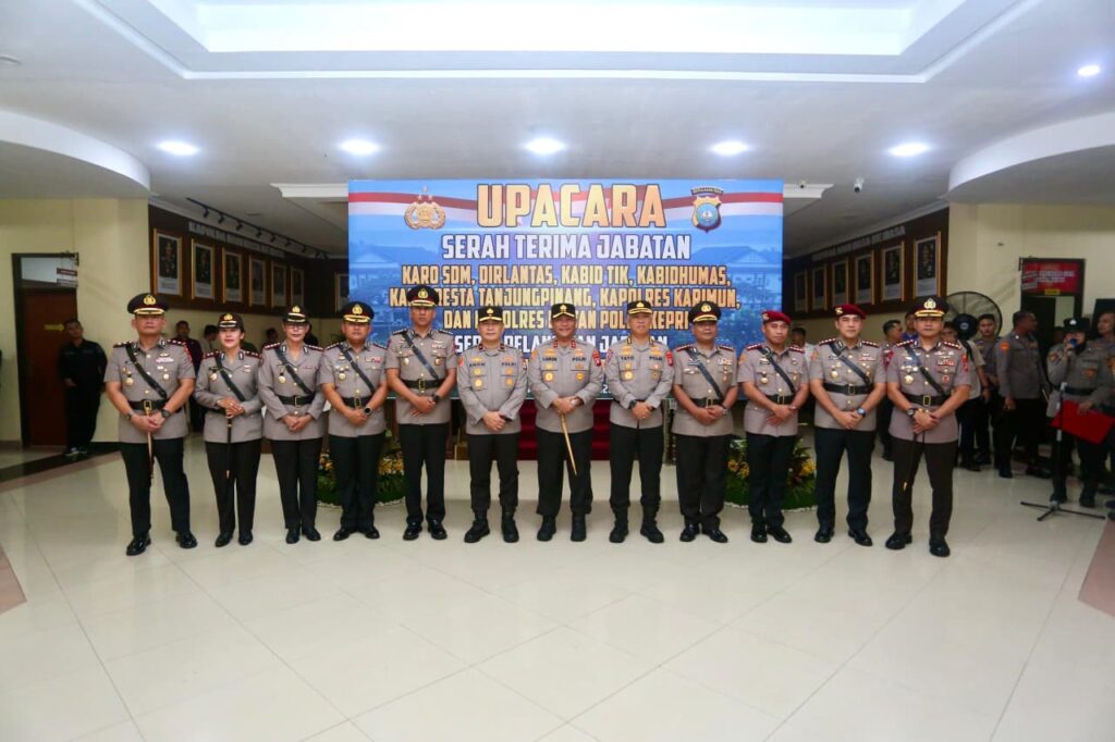 BeritaSatuKepri Batam – Kapolda Kepulauan Riau Irjen. Pol. Asep Safrudin, S.I.K., M.H., memimpin upacara Serah Terima Jabatan (Sertijab) sejumlah pejabat utama di lingkungan Polda Kepri, meliputi Karo SDM, Dirlantas, Kabid TIK, Kabidhumas, Kapolresta Tanjungpinang, Kapolres Karimun, dan Kapolres Bintan. Selain itu, turut dilaksanakan pelantikan jabatan Dirreskrimum dan Dirresnarkoba Polda Kepri. Kegiatan tersebut berlangsung di Lobby Utama Polda Kepri, Rabu (7/1/2026).