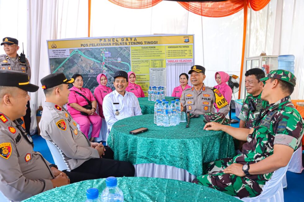 BeritaSatuKepri Tebing Tinggi — Kapolres Tebing Tinggi AKBP Drs. Simon Paulus Sinulingga, S.H. bersama Walikota Tebing Tinggi H. Iman Irdian Saragih, S.E., unsur Forkopimda Kota Tebing Tinggi serta Ketua Bhayangkari Cabang Tebing Tinggi melaksanakan kunjungan ke Pos Pengamanan, Pos Pelayanan dan Pos Terpadu Natal 2025 dan Tahun Baru 2026 (Nataru), pada Rabu (24/12/2025).