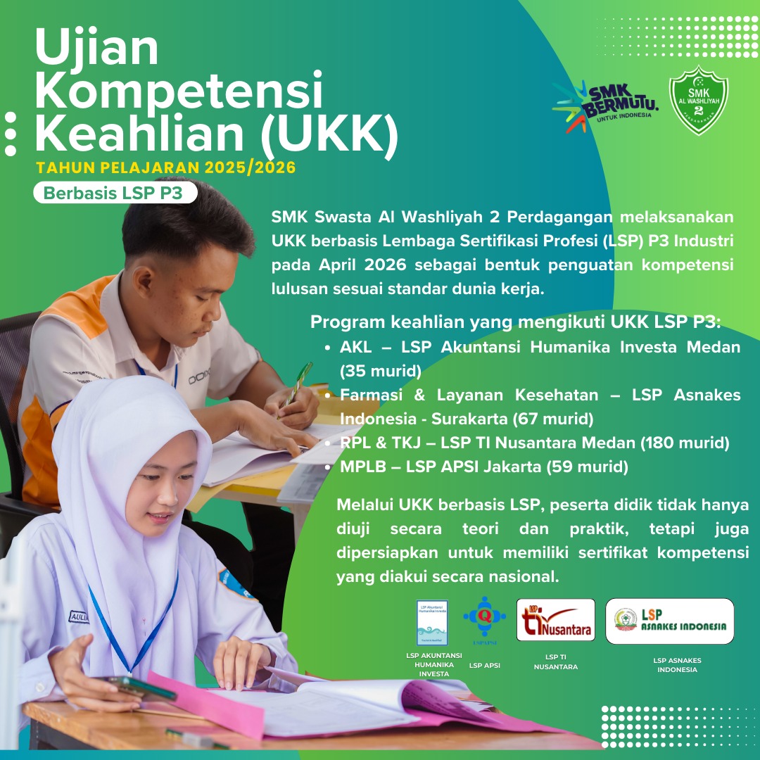 Kepala SMK Swasta Al Washliyah 2 Perdagangan kepada wartawan, Jumat(30/1/2026) mengatakan UKK berbasis LSP P3 tersebut sebagai bentuk penguatan kompetensi lulusan sesuai standar dunia kerja.