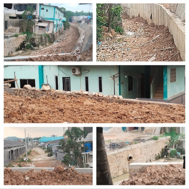 Hasil dokumentasi lapangan memperlihatkan beberapa berada hanya beberapa jengkal dari tepi galian. Ruang sempit antara konstruksi drainase dan bangunan rumah membuat risiko longsor dan amblas meningkat, terlebih dengan gundukan tanah besar yang dibiarkan menumpuk.